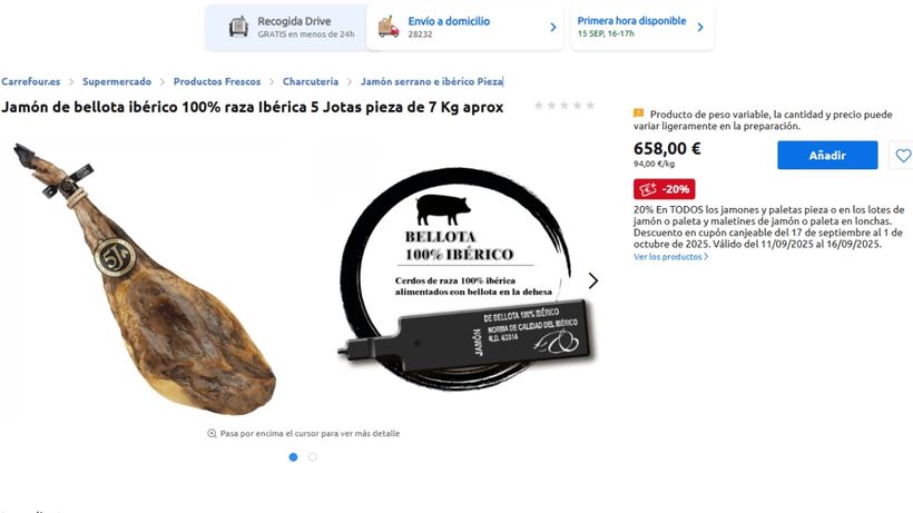 Serrano ham lovers are congratulations because the 5 jotas brand is not the only one that has Discounts in Carrefour. It can be bought cheaper that of Sánchez Alcaraz of 8 kilos, for 159 euros, or that of Iberian Legacy Gold series of El Pozo, a piece of approximately 7 kilos that costs 185 euros.
