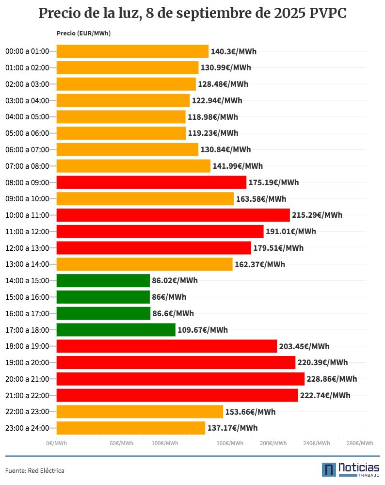 The average price of light for consumers with regulated or indexed rate in the free market will be 152.3 euros/MWh this Monday, September 8, 2025, as stated by Eléctrica. This represents a 55.54% rise with respect to Sunday pricewhich means an increase of 54.39 euros.
