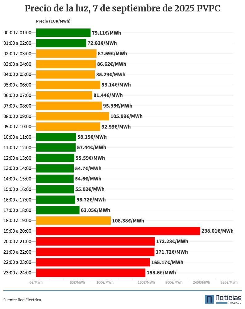 The average price of light for consumers with regulated or indexed rate in the free market will be 97.91 euros/MWh this Sunday, September 7, 2025, as gathered by Electric. This represents a 11.14% increase with respect to Saturday pricewhich means a rise of 9.81 euros.