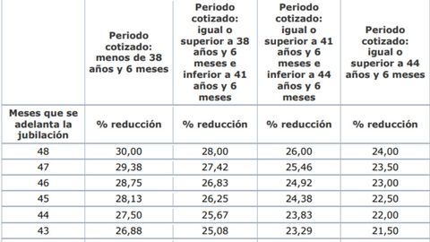 Penalties vary depending on the modality. For voluntary early retirement, which allows a maximum advance of 24 months, the cuts range from 2.81% to 21% on the pension. On the other hand, in involuntary early retirement, with an advance of up to 48 months, the range of the reduction ranges from 0.50% to a maximum of 30%.