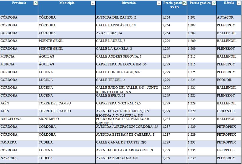 The cheapest service stations to refuel gasoline this week are in Autacor in Córdoba, located on Avenida del Zafiro, 2 where 1,264 euros are paid. Then, in this province it is also paid in Plenergy at 1,264 euros (Lapislázuli street) and in the Ballenoil de Córdoba also where it costs 1,264 euros (Libya Avenue, 34).
