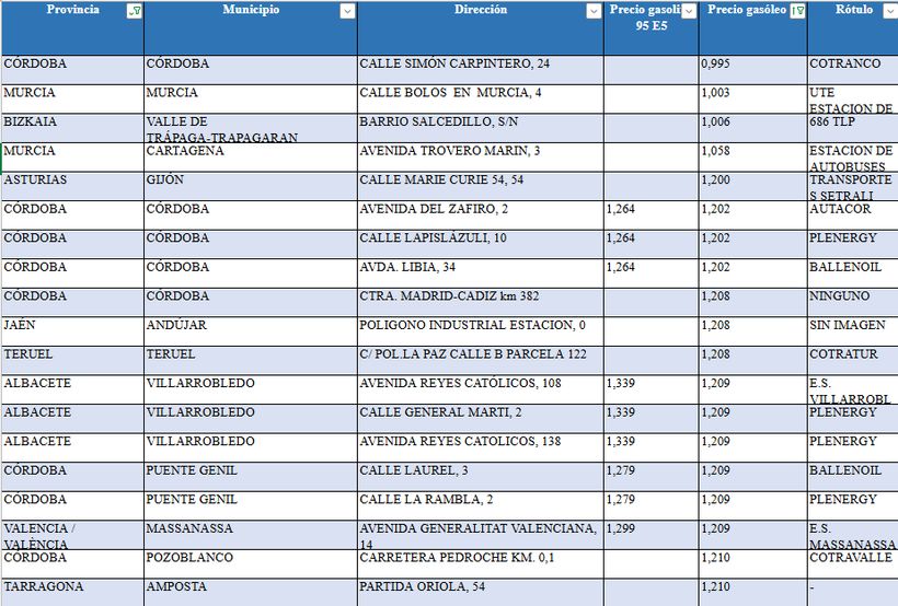 The cheapest price of diesel this week is once again in the Cotranco de Córdoba gas station (0.995 euros), located on Simón Carpintero street number 24. Then, another good option is the station in Murcia, on Bolos street number 4 where you pay at 1,003 euros, 686 TLP of Vizcaya where it costs 1.006 at the service station of the Salcedillo neighborhood.
