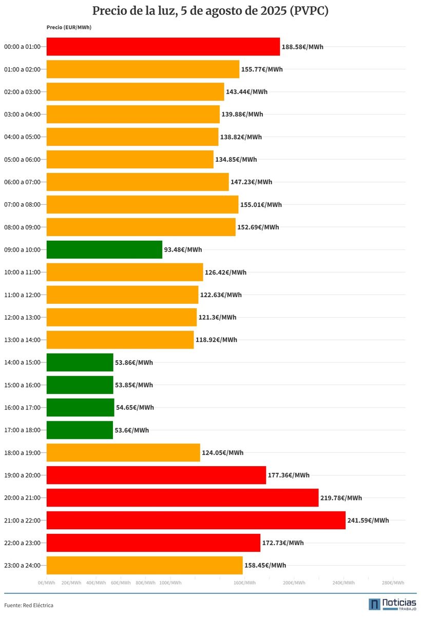 The average price of electricity for this Tuesday, August 5, 2025, drops to 135.37 euros/MWh for consumers with regulated or indexed rate in the free market, according to data published by Red Electric. This means that the light is paid by 7.12% cheaper than the Monday, August 4, when its price was 145.75 euros/MWh.
