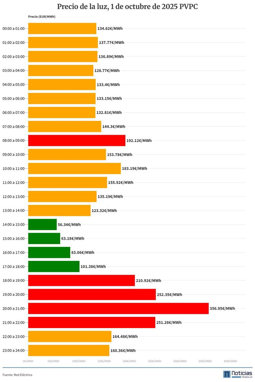 The average price of electricity for this Wednesday, October 1, 2025, rises again to 155.23 euros/MWh for consumers with regulated or indexed rate in the free market, according to data published by Red Electric. This means that the light is paid 1.02% more expensive than the Tuesday, September 30, when its price was 153.66 euros/MWh.