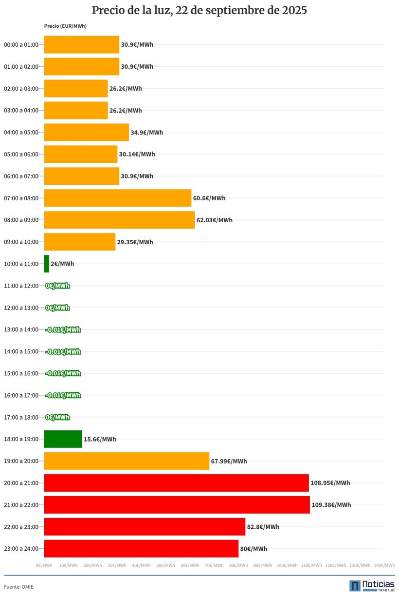 The lowest electricity price for Monday, September 22 will be at the strip between 1:00 p.m. and 5:00 p.m. with a cost of -0.01 euros/MWh. The next cheapest strip will be between 11:00 and 1:00 p.m. when it will be paid at 0 euros/MWh, as between 5:00 and 18:00, which will also mark a price of 0 euros/MWh. Negative prices or that mark 0 euros do not mean that light is free in those hours.
