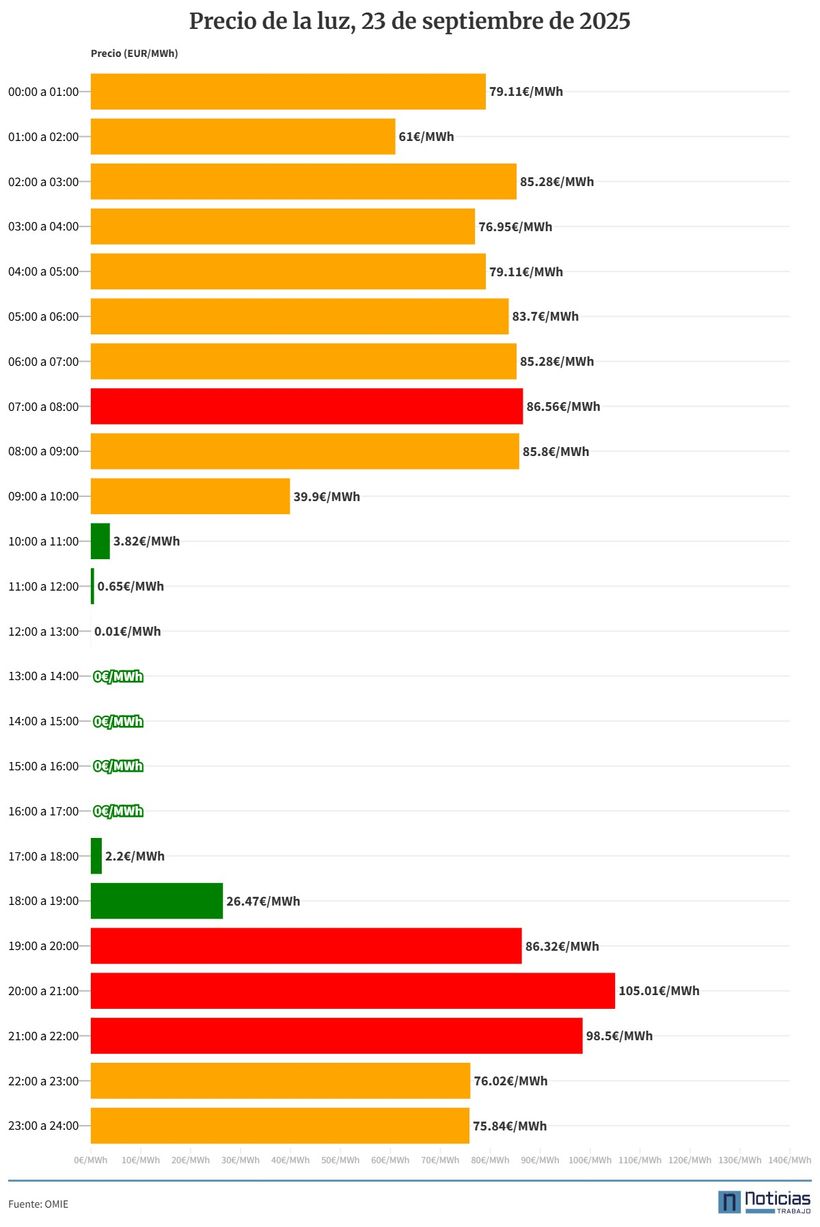 The lowest electricity price for this Tuesday, September 23 will be at the strip between 1:00 p.m. and 5:00 p.m. with a cost of 0 euros/MWh. The next cheapest hour will be between 12:00 and 1:00 p.m. when it will be paid at 0.01 euros/MWh. The prices that mark 0 euros do not mean that the light is free in those hours.